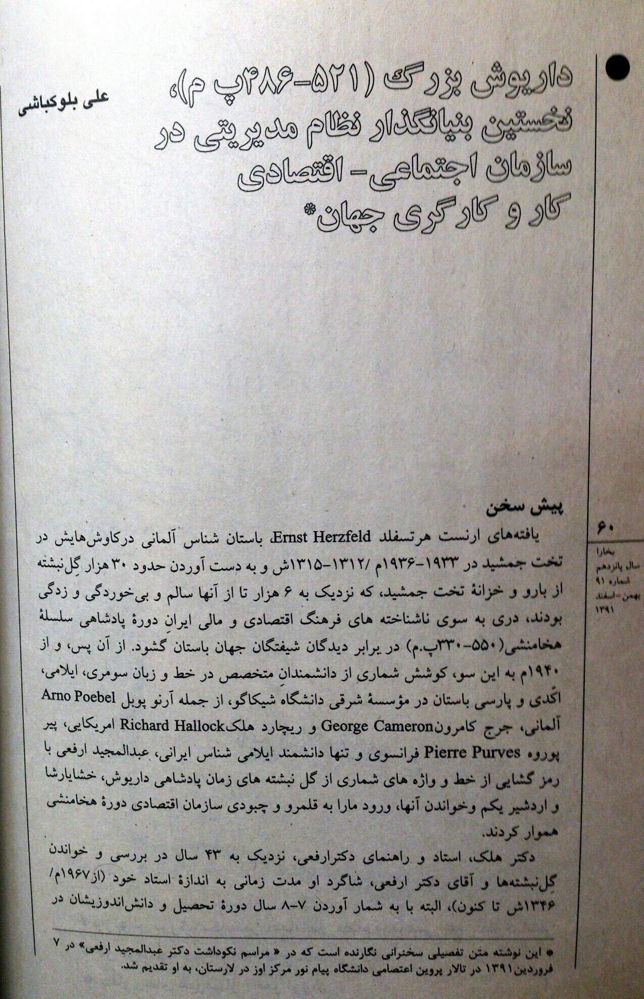 صفحه ۶۰تا ۷۹ این شماره ی بخارا به مقاله ی(داریوش بزرگ(۵۲۱-۴۸۶پم)،نخستین بنیانگزار نظام مدیریتی در سازمان اجتماعی_اقتصادی کار و کارگری در جهان) نوشته دکتر علی بلوک باشی اختصاص یافته است.